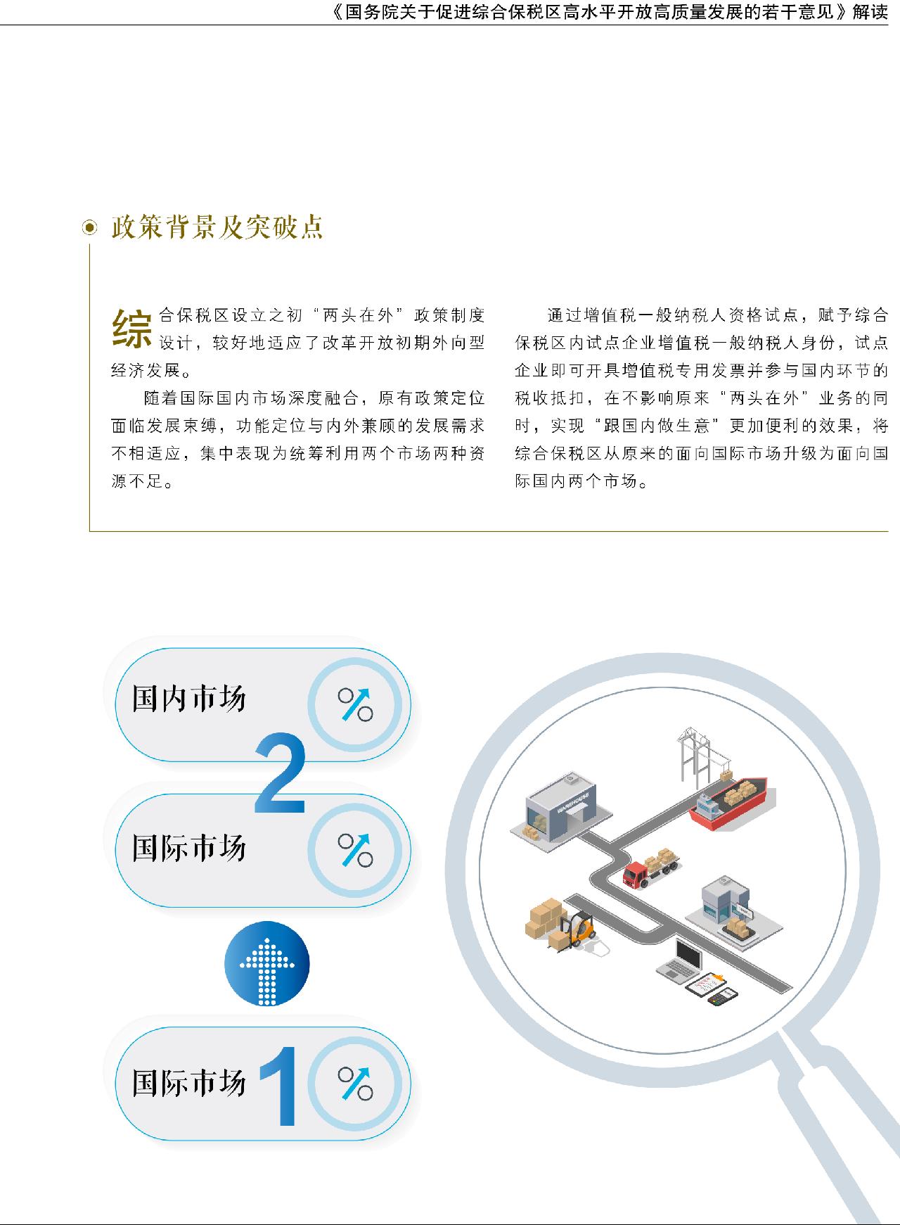 通过增值税一般纳税人资格试点,赋予综合保税区内试点企业增值税一般纳税人身份,试点企业即可开具增值税专用发票并参与国内环节的税收抵扣,在不影响原来“两头在外”业务的同时,实现“跟国内做生意”更加便利的效果,将综合保税区从原来的面向国际市场升级为面向国际国内两个市场。