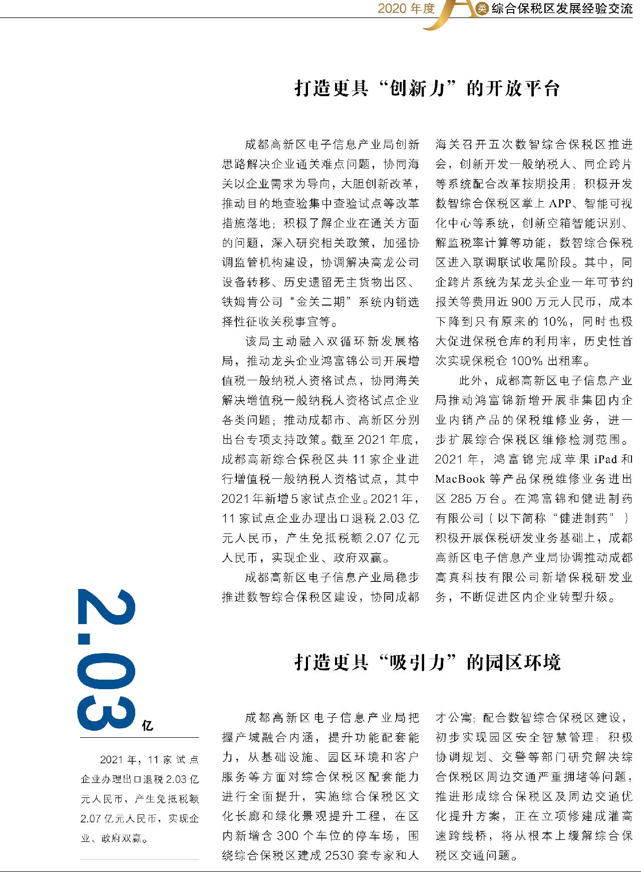 为帮助企业打通内销堵点,成都海关联合四川省药监部门解决综合保税区内药品内销的许可证件验核问题,同时运用特殊申报功能,在企业交齐申报材料、海关审核通过后不到1个小时,药品即可出区发往国内市场,由此产生了全国综合保税区首个“出口+内销”政策创新模式药品,同时也是全国综合保税区首次实现药品国内国际双循环。