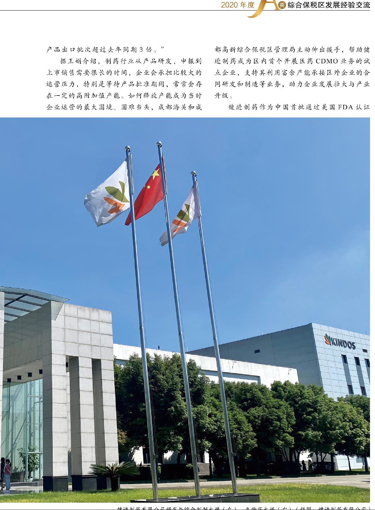 健进制药的快速发展离不开成都高新综合保税区管理局及海关的持续政策创新和不断提升的开放平台能级。健进制药战略发展总监王娟介绍:“我在健进制药工作了近15年,经历了健进制药依托综合保税区优势逐步进入稳健有力发展快车道的全过程。制药企业的成长往往需要十余年的漫长培育,综合保税区的政策创新带给我们跨越发展关键的‘三连跳’:第一跳是率先开展 CDMO 业务,拓展了企业的业务模式和新的利润增长点;第二 跳是试点‘保税研发’,提升了企业研发效率,节约了研发成本;第三跳是打通综合保税区药品通关内销的便捷通路,真正让国际高标准的重大疾病治疗药物实现国内国际双循环。特别是2020年以来,随着国内外合作项目与订单逐渐增多,企业扩建扩产的需求也在同步增加,又一条新生产线在2022年内就要计划投产;2022年1月至2月,公司出口额已较去年同期翻一番,高端注射剂产品出口批次超过去年同期3倍。”